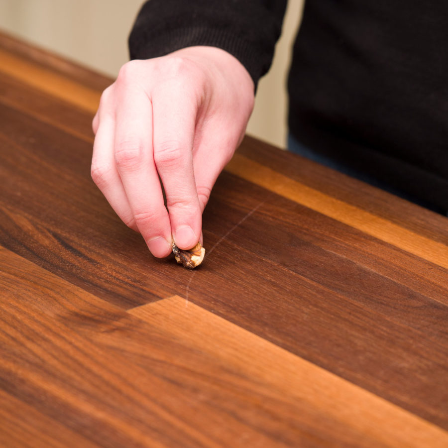 - Try rubbing a piece of raw walnut on a light but visible scrape on the surface of a wood furnishing product to provide a temporary natural lustre.